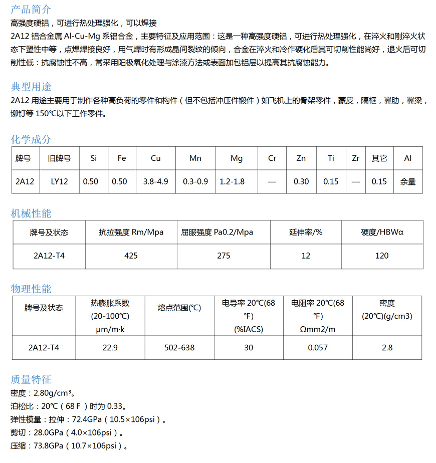 類 別:航空硬鋁合金 鋁棒品種:普通鋁棒、精拉鋁棒、進(jìn)口鋁棒、磨光棒、鋁鍛件.... 供貨狀態(tài):H112、T4、T3、T451、T351、O... 圓 棒:Φ3mm-420mm 方 棒:高3~150mm*寬20~500mm 六角棒:S=6~50mm(對邊) 價(jià) 格:電議 庫 存:庫存充足